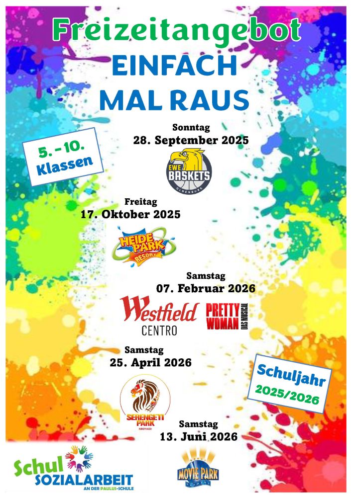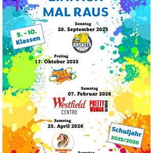 „Einfach mal raus!“ beinhaltet Tagesfahrten zu kulturellen und sportlichen Freizeitangeboten, welche um Laufe des Schuljahres organisiert werden. Die Angebote sind freiwillig und kostengünstig.